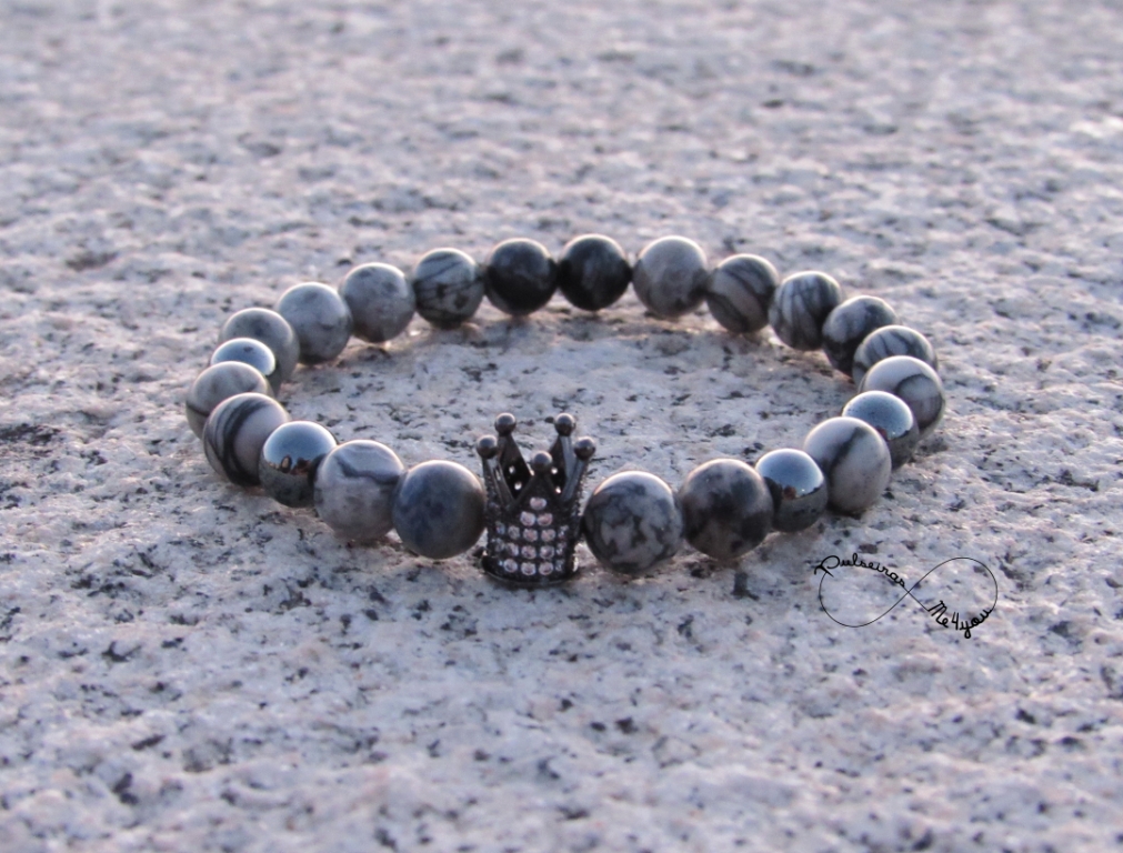 Pulseira feita com Pedras naturais de 8mm cinza matizado, Hematite e Coroa Micro Pave Zirconia Cúbica