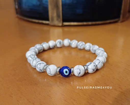 Pulseira Pedras 8mm Branco Howlita e Olho Turco & Peças Metálicas em Aço